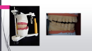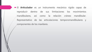 El documento describe el articulador, un instrumento mecánico que reproduce los movimientos mandibulares y la relación cráneo-mandibular. Se usa para diagnosticar patologías oclusales y planificar tratamientos odontológicos. Existen diferentes tipos de articuladores que varían en su capacidad de simular movimientos mandibulares.