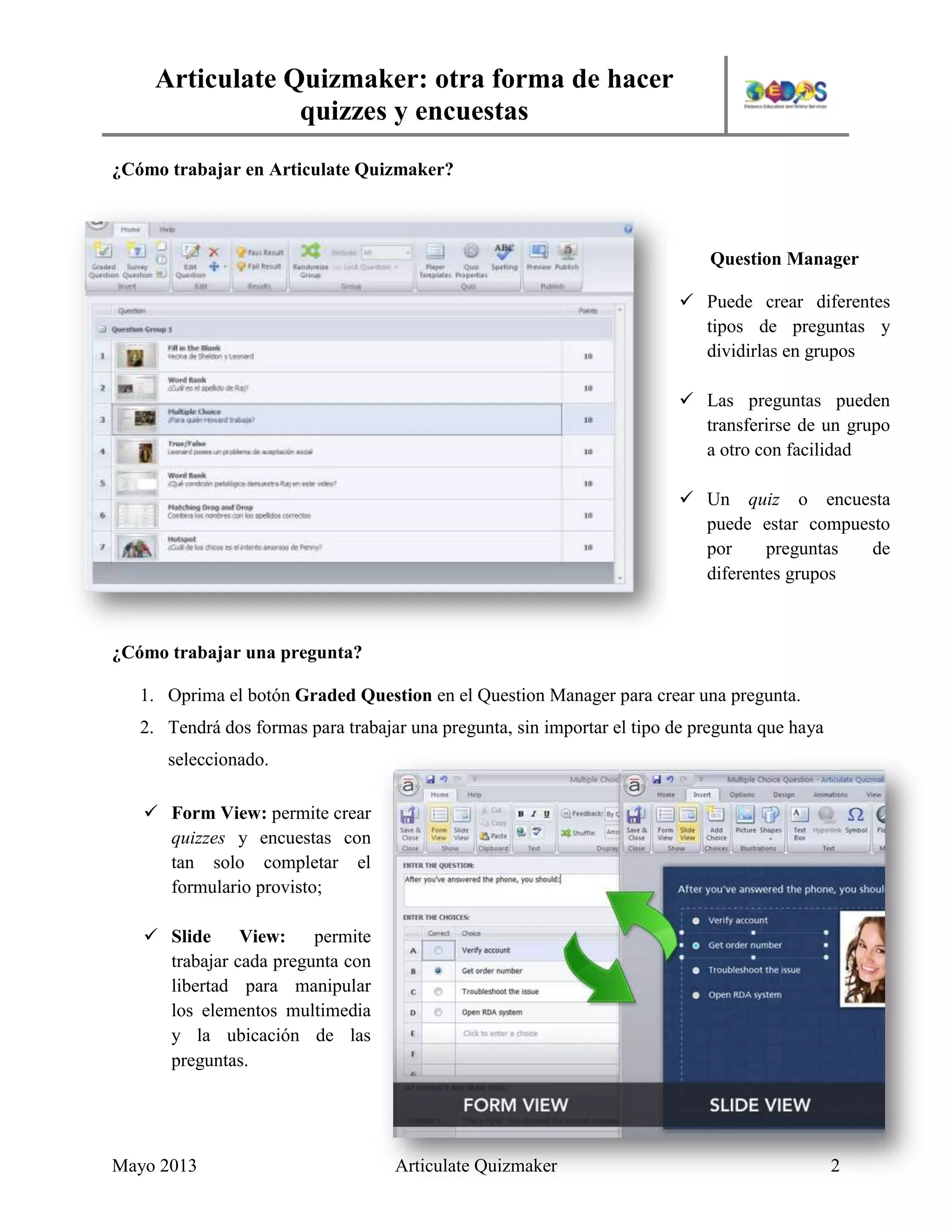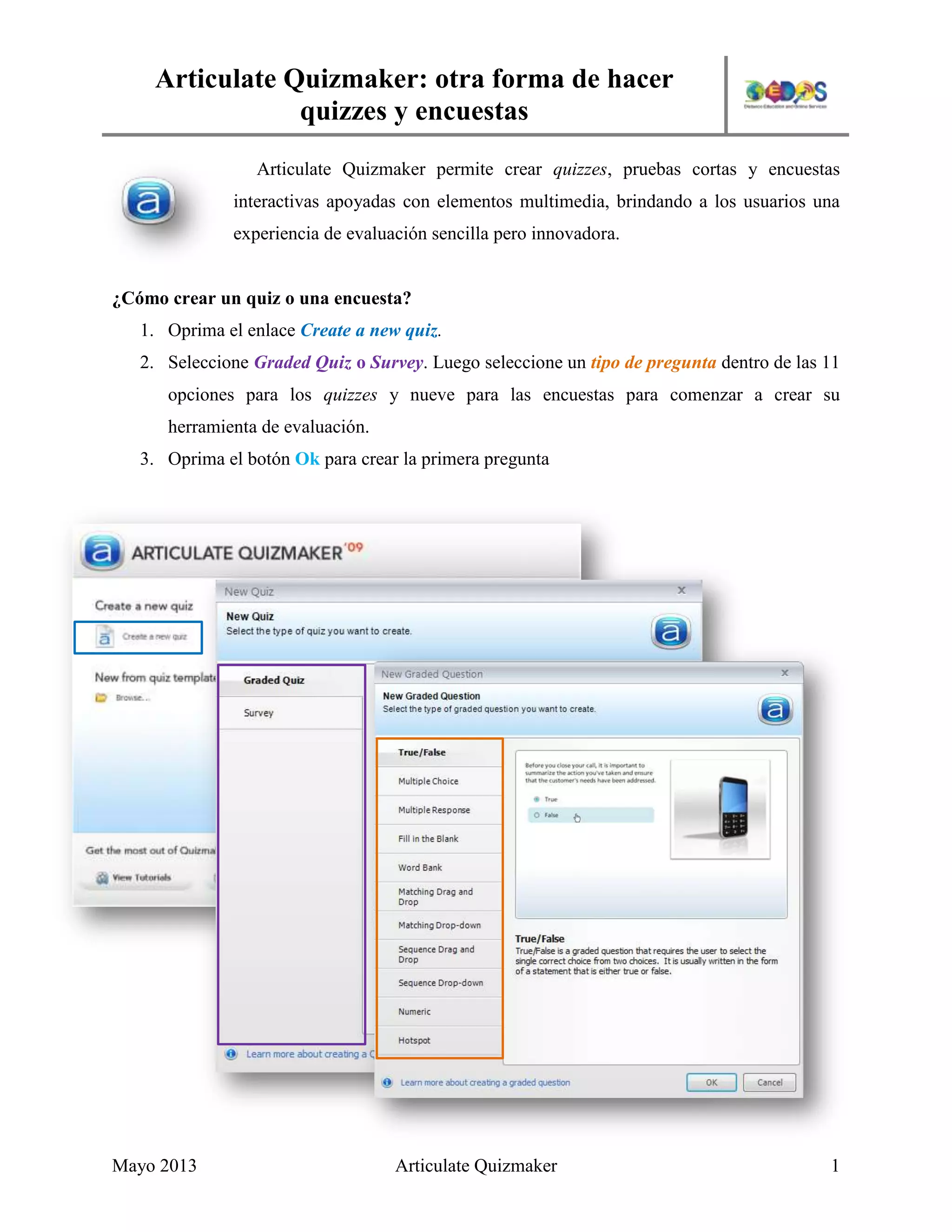 Articulate Quizmaker permite crear quizzes, pruebas cortas y encuestas interactivas con elementos multimedia, ofreciendo una experiencia de evaluación sencilla e innovadora. El documento explica cómo crear quizzes y encuestas, agregar preguntas y medios, establecer propiedades y publicarlos en diferentes formatos como Articulate Presenter, web y Word.