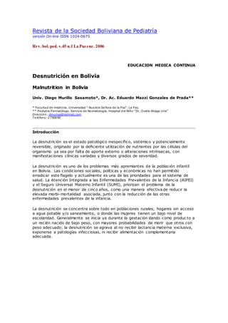 Este documento describe la desnutrición en Bolivia. La desnutrición es un problema apremiante entre la población infantil en Bolivia debido a las condiciones sociales, políticas y económicas. Programas como la Atención Integrada a las Enfermedades Prevalentes de la Infancia (AIPEI) y el Seguro Universal Materno Infantil (SUMI) priorizan la reducción de la desnutrición en menores de cinco años para reducir la morbilidad y mortalidad asociadas. La desnutrición se concentra más en poblaciones