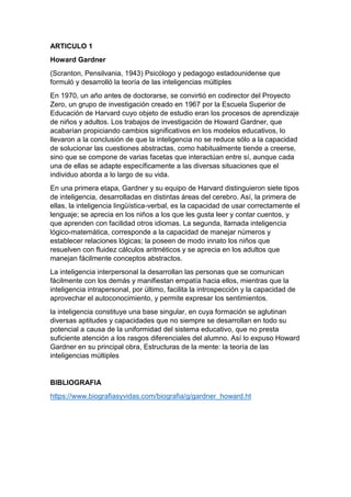 Howard Gardner, psicólogo estadounidense, formuló la teoría de las inteligencias múltiples que sostiene que la inteligencia no se reduce a la capacidad de resolver problemas abstractos, sino que se compone de varias facetas que interactúan. Originalmente identificó siete tipos de inteligencia: lingüística, lógico-matemática, espacial, corporal-cinestésica, musical, interpersonal e intrapersonal. Su teoría propuso que el sistema educativo debería prestar más atención a los rasgos diferencial