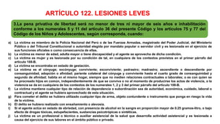 Este artículo establece las penas por lesiones leves. Define lesiones leves como aquellas que requieren más de 10 pero menos de 20 días de asistencia médica. Establece penas de prisión de 2 a 5 años. Si la víctima muere, la pena es de 6 a 12 años. También describe circunstancias agravantes y penas más altas cuando la víctima es un menor, miembro de las fuerzas de seguridad, o cuando se aprovecha de su condición.