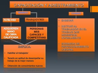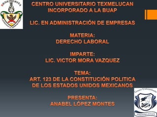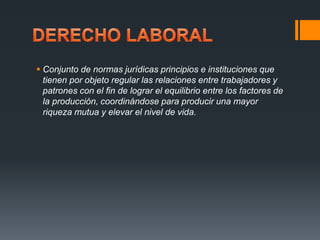 El documento resume los principales aspectos del derecho laboral mexicano establecidos en la Constitución y las leyes federales. Regula la jornada laboral, salario mínimo, utilidades, derechos de mujeres embarazadas, sindicatos, seguridad social, y distingue entre las relaciones laborales de los trabajadores del sector privado y público.
