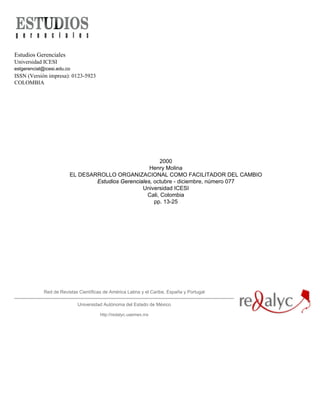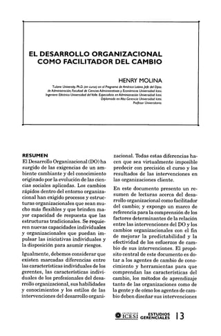 Este documento presenta un marco de referencia para comprender la relación entre las intervenciones de desarrollo organizacional y los cambios en las organizaciones. Explica que los resultados de las intervenciones se verán influenciados por factores como la naturaleza del cambio, el estilo de intervención, el nivel de incertidumbre del entorno y las características de los gerentes, profesionales, intervención y organización. El propósito es ayudar a los agentes de cambio a diseñar intervenciones más efectivas al comprender mejor estos factores y