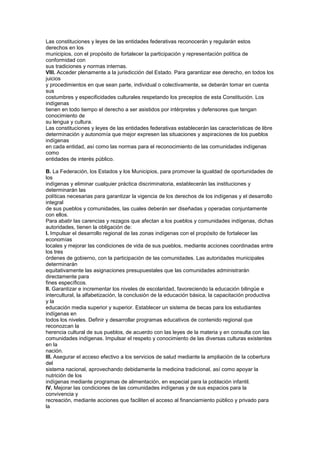 Este documento establece los derechos de los pueblos y comunidades indígenas en México. Reconoce su derecho a la libre determinación y autonomía para gobernarse internamente de acuerdo con sus propias costumbres. También garantiza su derecho a preservar su cultura e identidad y a acceder a recursos naturales. Además, obliga a las autoridades federales, estatales y municipales a implementar políticas para promover el desarrollo económico y social de los pueblos indígenas y eliminar la