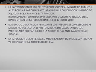 Este documento establece las bases del sistema nacional de seguridad pública en México. Asigna la responsabilidad de investigar delitos al Ministerio Público y a las policías bajo su mando. Determina que la imposición de penas corresponde a la autoridad judicial. También establece los principios de legalidad, objetividad y respeto a los derechos humanos que deben regir a las instituciones de seguridad pública.