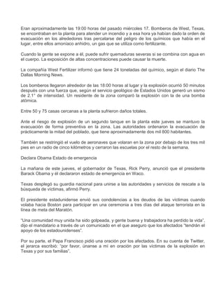 La explosión en una planta de fertilizantes en West, Texas causó entre 5 y 15 muertes y más de 160 heridos. Un video capturó el momento de la explosión, la cual ocurrió mientras los bomberos atendían un incendio en la planta. Las autoridades ordenaron la evacuación preventiva de la mitad de la población local debido al riesgo de una segunda explosión. El presidente Obama declaró estado de emergencia en la zona afectada.
