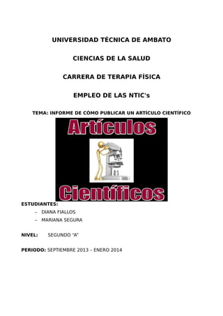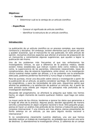 Este documento describe cómo publicar un artículo científico. Explica la estructura de un artículo científico y los pasos para publicarlo, incluyendo seleccionar una revista de calidad, seguir sus pautas de redacción y citación, y revisar el artículo antes de la publicación. También menciona algunas revistas científicas latinoamericanas reconocidas donde se pueden publicar artículos.