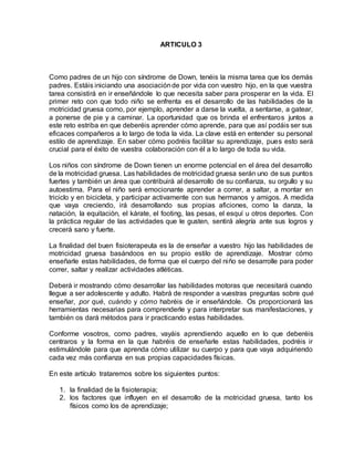 Este documento discute los objetivos de la fisioterapia para niños con síndrome de Down. El objetivo principal no es acelerar el desarrollo motor, sino desarrollar habilidades motoras que permitan un cuerpo funcional de por vida. Se discuten cuatro resultados cruciales tempranos que son importantes para lograr esto: 1) desarrollar un patrón de marcha efectivo, 2) aprender a correr, saltar y realizar actividades atléticas, 3) adquirir habilidades motoras necesarias de adolescente y adulto, 4) estimular