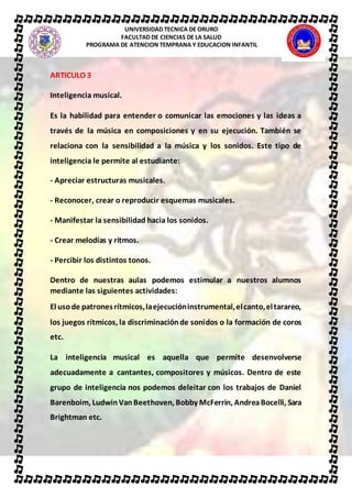 La inteligencia musical permite entender y comunicar emociones e ideas a través de la música y ser sensible a los sonidos musicales. Estimula habilidades como apreciar estructuras musicales, reconocer o crear patrones musicales, y crear melodías y ritmos. Dentro del aula se puede estimular esta inteligencia en los estudiantes mediante actividades como el uso de patrones rítmicos, ejecución instrumental, canto, juegos rítmicos y formación de coros.