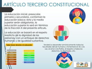 El documento resume los principales puntos del Artículo 3o de la Constitución Política de los Estados Unidos Mexicanos relacionados con la educación. Establece que la educación debe ser universal, obligatoria, gratuita, laica y de calidad. Además, define los diferentes niveles educativos y los roles del Estado y las instituciones educativas.