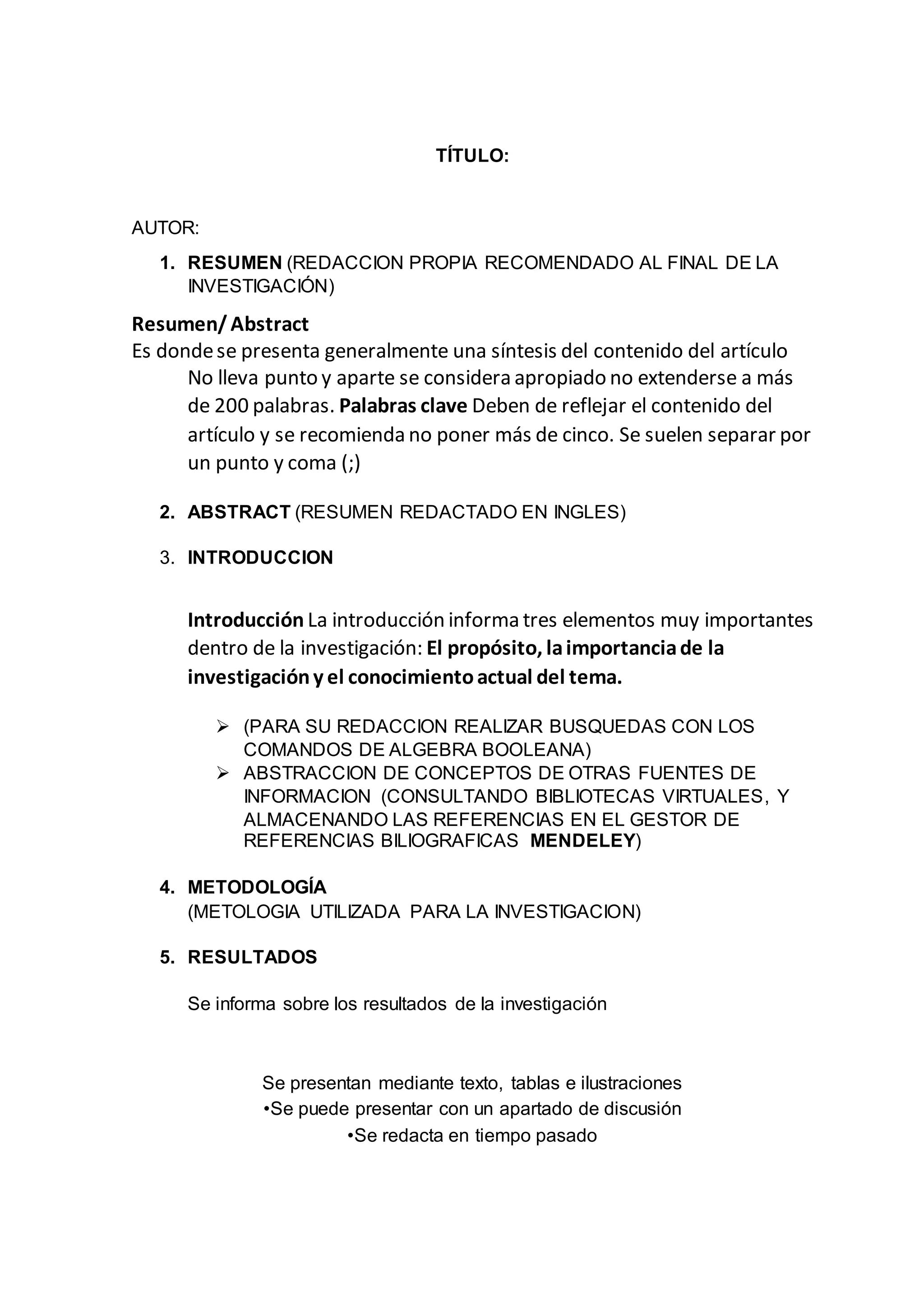 Este documento ofrece instrucciones para la redacción de diferentes secciones de un artículo de investigación, incluyendo el resumen, introducción, metodología, resultados, conclusiones y bibliografía. Explica que el resumen debe resumir el contenido del artículo en 200 palabras o menos, e incluir palabras clave. La introducción debe describir el propósito, importancia e información actual sobre el tema. La metodología explica los métodos utilizados. Los resultados se presentan con texto, tablas e ilustraciones. Las conclusiones resumen los hallazgos