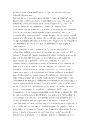 El comercio ambulante ha sido una actividad tradicional en México desde la época prehispánica. Sin embargo, actualmente es considerado parte de la "economía informal" y opera de manera ilegal. A pesar de su importancia económica y de proveer empleo y sustento a millones de mexicanos, el comercio ambulante no está regulado y sus trabajadores no cuentan con seguridad social. Se requieren políticas fiscales más flexibles que reconozcan la realidad del comercio ambulante en lugar de diabolizarlo.