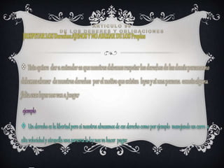 El documento presenta los deberes y obligaciones de tres estudiantes - Maya Taquez Yuleidy Nayeli, Ordoñes Bermeo Sonia Sarai y Revelo Melo Erika Yuliana - de la Institución Educativa Rural Francisco Jse de Caldas en el año 2015. El documento incluye la protección de los recursos culturales y naturales del país y la conservación de un ambiente sano como deberes de los ciudadanos.