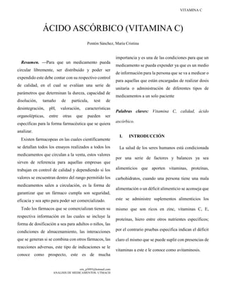 El documento describe la vitamina C, también conocida como ácido ascórbico. Explica que la vitamina C es hidrosoluble y se encuentra en muchas frutas y verduras. También habla sobre los controles de calidad que deben pasar los medicamentos de vitamina C antes de ser comercializados y las posibles consecuencias de tomar vitamina C en exceso.