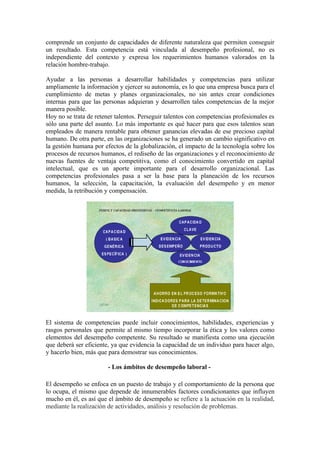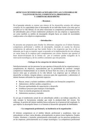 El documento discute tres categorías clave relacionadas con el desempeño laboral: el talento humano, la competencia profesional y el ámbito de desempeño. Explica que estas categorías interactúan y se integran para formar la base de la gestión empresarial exitosa. También analiza cada categoría individualmente, describiendo enfoques para desarrollar el talento humano, ejemplos de competencias profesionales valiosas y diferentes niveles de ámbitos de desempeño.