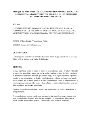 Es importante enseñar emprendimiento a los estudiantes de bachillerato para prepararlos para el futuro luego de graduarse, ya que no sabrán si continuar estudiando o trabajar. El emprendimiento les enseña a crear negocios y competir para generar ingresos. Conocimientos sobre temas económicos, políticos y tecnológicos son fundamentales para los emprendedores. La investigación se realizó en una unidad educativa en Riobamba para analizar los resultados de enseñar emprendimiento a los estudiantes y ayudarlos a eleg
