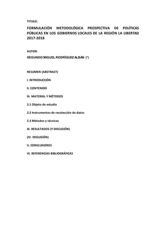 Este documento presenta el proceso metodológico prospectivo para el diseño de políticas públicas en los gobiernos locales de la región La Libertad en Perú entre 2017-2018. Explica diversas herramientas metodológicas como análisis causal, análisis de actores, costo-beneficio, y prospectiva estratégica que pueden usarse para analizar problemas públicos, diseñar políticas y tomar decisiones. El objetivo es orientar el uso de estas herramientas para encontrar soluciones adecuadas a los problemas de la región.