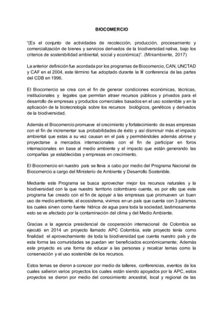 El documento habla sobre biocomercio en Colombia. Explica que biocomercio involucra la recolección, producción y comercialización de bienes y servicios derivados de la biodiversidad de manera sostenible. También describe cómo el Programa Nacional de Biocomercio en Colombia apoya empresas que usan recursos naturales de forma sostenible. Además, menciona un proyecto de 2014 llamado APC Colombia que buscaba aprovechar la biodiversidad del país para beneficiar económicamente a las comunidades de manera sostenible.