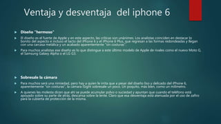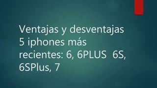 El documento resume las principales ventajas y desventajas de los iPhones 6, 6 Plus, 6S, 6S Plus e iPhone 7. Algunas ventajas clave son los diseños atractivos, pantallas más grandes y mejoradas, y mayor capacidad de almacenamiento. Algunas desventajas incluyen la cámara sobresaliente, batería con solo un día de duración, y la falta de entrada para auriculares en el iPhone 7.