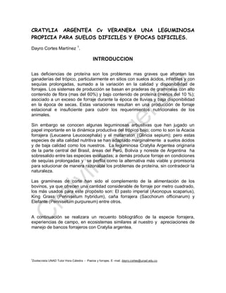 Cratylia argentea es una leguminosa arbustiva que produce forraje de alta calidad incluso durante sequías prolongadas. Se adapta a suelos ácidos y pobres y tiene altos niveles de proteína (18-30%). Produce 0.7-0.9 toneladas de forraje por hectárea en el primer corte y 1-2 kg de forraje por planta en cortes posteriores. Las semillas se cosechan manualmente una vez por semana durante varios meses y cada planta puede producir 50-70 gramos de semillas, lo que equivale