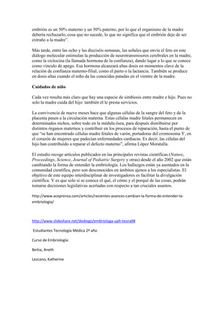 El documento resume un informe científico reciente sobre la comunicación entre la madre y el hijo durante el embarazo. El estudio encontró que la madre y el hijo se comunican a nivel molecular desde las primeras etapas del desarrollo, y que esto ayuda a establecer un vínculo de apego entre ellos. Además, las células del hijo pueden pasar a la circulación de la madre y ayudar a reparar sus órganos. Estos hallazgos cambian la comprensión de la embriología, pero son aún desconoc