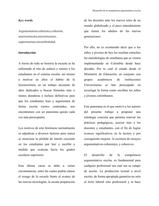 El documento discute las dificultades que tienen los estudiantes de secundaria en desarrollar la competencia de la argumentación escrita. Propone el ensayo como una estrategia para mejorar esta habilidad. Explica algunas de las causas de las deficiencias de los estudiantes y presenta teóricos como Van Dijk que analizan conceptos como la coherencia, cohesión y estructura de los textos para fortalecer la competencia argumentativa escrita.