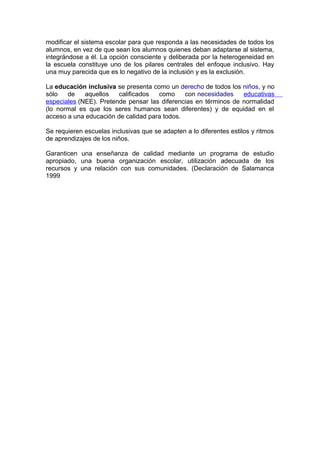 El documento analiza si la inclusión en las aulas dominicanas es un deseo o una realidad. Plantea que aunque la inclusión se contempla en el currículo, en la práctica prevalece la exclusión y el favoritismo. Para que la inclusión sea real, los sistemas educativos deben diseñarse para entender las distintas características de los estudiantes y crear estrategias que permitan espacios inclusivos. También se requiere personal docente capacitado y una infraestructura adecuada para proyectos inclus