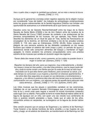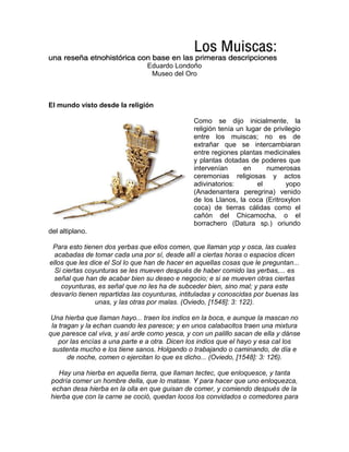 El documento resume aspectos de la religión de los muiscas antes de la llegada de los españoles. Los muiscas tenían una religión politeísta y realizaban ceremonias que involucraban el consumo de plantas alucinógenas. Creían en deidades como Chiminigagua, el Sol, la Luna y Bochica. Ofrecían ofrendas de oro y esmeraldas en templos y lugares sagrados como bosques y lagunas. Al morir, los caciques y personas importantes eran enterrados con sus pertenencias y tesoros.