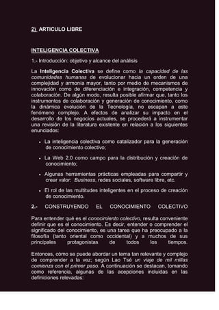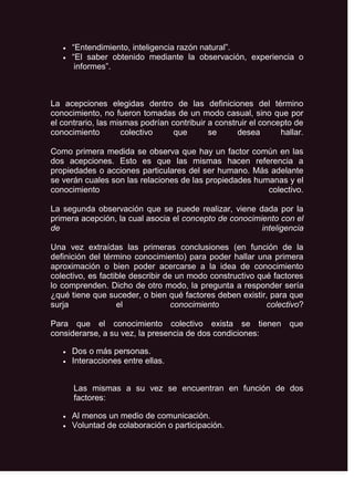 El documento describe la inteligencia colectiva y cómo se puede utilizar para generar conocimiento a través de la colaboración entre personas. Explica que herramientas como Internet, redes sociales y software libre permiten que grupos compartan y creen conocimiento. También presenta ejemplos como Wikipedia, Linux y juegos en línea que aprovechan las respuestas de los usuarios para entrenar sistemas de inteligencia artificial.