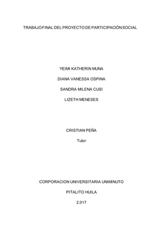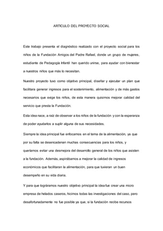 Este documento presenta el proyecto social realizado por un grupo de estudiantes de pedagogía infantil para los niños de la Fundación Amigos del Padre Rafael. Su objetivo principal fue diseñar un plan para generar ingresos que facilitaran la alimentación y gastos de los niños. Inicialmente propusieron crear una microempresa de helados caseros, pero desafortunadamente los ingresos debían enviarse a la oficina principal. En cambio, decidieron ayudar a celebrar la primera comunión de los niños consiguiendo decoración y un pastel.