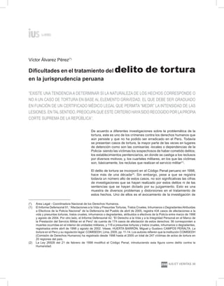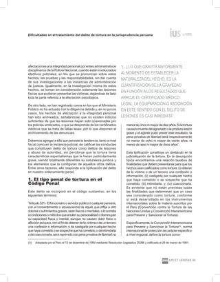 El documento discute las dificultades en el tratamiento del delito de tortura en la jurisprudencia peruana. Señala que a pesar de que la tortura se incorporó al Código Penal peruano en 1998, todavía hay un alto número de casos que no han sido investigados o juzgados. También indica que la definición de tortura en el Código Penal es más limitada que en instrumentos internacionales, y que el elemento de "gravedad" ha sido una barrera para establecer la tortura en muchos casos. Finalmente, analiza cómo la juris
