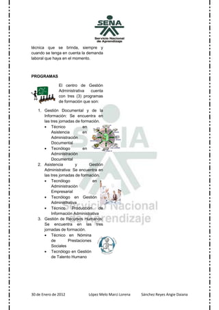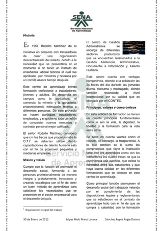 Este documento describe la historia y operaciones de un centro de aprendizaje en Colombia. Fue fundado en 1957 por Rodolfo Martínez para brindar formación profesional a trabajadores, jóvenes y adultos en campos como la agricultura, el comercio y la minería. El centro ofrece programas en gestión documental, administración y recursos humanos para capacitar a las personas de manera gratuita e integral, con el fin de promover el desarrollo social y satisfacer las necesidades del sector empresarial.