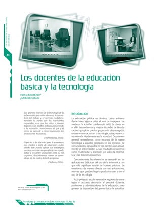 El documento discute los desafíos que enfrentan los docentes de educación básica ante los avances de la tecnología y cómo pueden aprovechar la tecnología para mejorar la enseñanza y el aprendizaje. Señala que la capacitación de docentes es crucial para que puedan incorporar estrategias innovadoras utilizando recursos tecnológicos de manera efectiva. También destaca la importancia de asegurar equidad educativa para todos los estudiantes.