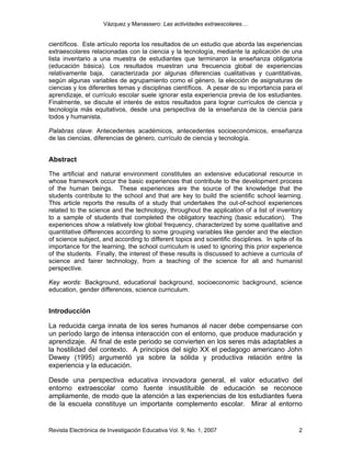 Este documento describe un estudio sobre las experiencias extraescolares de los estudiantes relacionadas con la ciencia y la tecnología. El estudio aplicó un inventario de actividades a una muestra de estudiantes que terminaron la educación obligatoria para analizar la frecuencia de dichas experiencias y posibles diferencias según variables como el género y la elección de asignaturas científicas. Los resultados mostraron que la frecuencia global de experiencias fue relativamente baja y varió cualitativa y cuantitativamente dependiendo de las variables. El documento disc