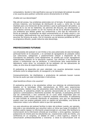 El documento habla sobre diferentes tecnologías de información para la educación como podcasting, videoblogging y screencasts. El podcasting permite que la educación se haga más accesible mediante la descarga automática de archivos de audio. El videoblogging utiliza video en lugar de texto para compartir comentarios y opiniones. Los screencasts capturan la pantalla de la computadora junto con audio para mostrar procedimientos. Todas estas tecnologías pueden usarse para ampliar las opciones educativas y facilitar el aprendizaje.