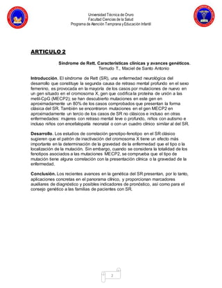 Este documento presenta tres artículos relacionados con el síndrome de Rett. El primer artículo describe tres fenotipos clínicos del síndrome de Rett basados en la capacidad de caminar. El segundo artículo discute las características clínicas del síndrome de Rett y los avances en la genética. El tercer artículo presenta el caso de una niña de 11 años con síndrome de Rett no diagnosticado previamente.