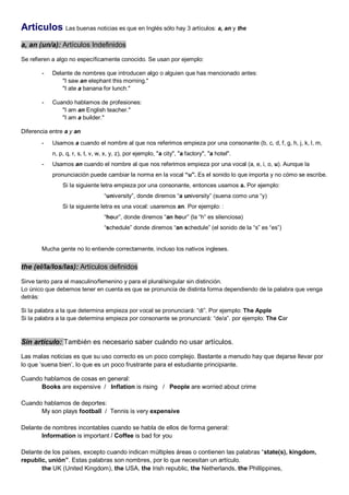 Este documento describe los tres artículos en inglés: a, an y the. Explica que a y an son artículos indefinidos que se usan para referirse a algo no específicamente conocido, y que la diferencia entre a y an depende de si la palabra siguiente comienza con vocal o consonante. También explica que the es el artículo definido y puede usarse para el masculino, femenino, singular o plural. Por último, proporciona ejemplos de cuando no se usa artículo.