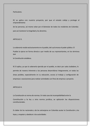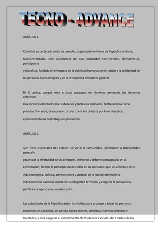 Este artículo establece que Colombia es un Estado social de derecho, organizado como una república unitaria, descentralizada y fundamentada en el respeto a la dignidad humana, el trabajo y la solidaridad. Reconoce la soberanía popular y establece que el Estado debe servir a la comunidad y promover la prosperidad general garantizando los derechos constitucionales. También indica que la Constitución es la norma suprema y deben respetarse sus disposiciones.