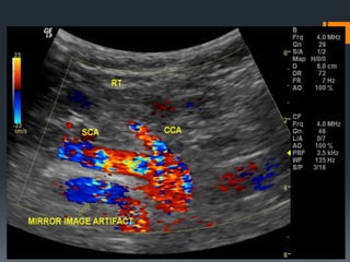 Este documento describe varios artefactos en ultrasonido que pueden alterar la realidad y llevar a error, incluyendo sombras acústicas, refuerzos posteriores, colas de cometa, refracción, reverberación, reflectores anisótropicos, efectos de velocidad de sonido, y ruido eléctrico. Explica cómo estos artefactos se producen y ofrece soluciones para algunos de ellos.