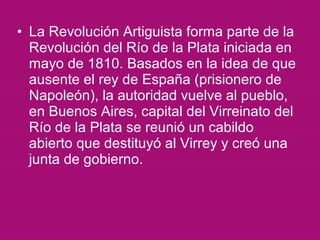 La Revolución Artiguista formó parte de la Revolución del Río de la Plata iniciada en 1810. Dirigentes descontentos en Buenos Aires tomaron el poder en nombre del pueblo e invocando al rey prisionero, pero se encontraron con rechazo de otros territorios como Montevideo. José Gervasio Artigas lideró la Revolución Oriental para apoyar inicialmente a Buenos Aires, pero luego la revolución tomó un camino propio aunque Artigas no buscaba la independencia de Uruguay.