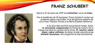 Este documento presenta resúmenes biográficos de cinco importantes artistas musicales: Franz Schubert, Antonio Vivaldi, The Beatles, Ludwig van Beethoven y Michael Jackson. Se destacan datos clave sobre su lugar y fecha de nacimiento, formación musical, obras más reconocidas y contribuciones que marcaron la historia de la música.