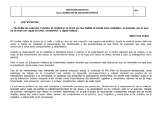 Este documento presenta la malla curricular de educación artística para el año 2015 de una institución educativa. Explica que la educación artística desarrolla la sensibilidad y expresión simbólica a través de lo sonoro, visual, corporal y literario. Define cuatro dimensiones de la educación artística: intrapersonal, interacción con la naturaleza, interpersonal e interacción contextual. También presenta los componentes de la educación artística como ético-estético, creativo-crítico-reflexivo