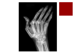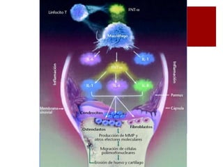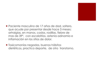 El documento describe el caso de un paciente masculino de 17 años con artritis reumatoide. Se presentan los síntomas, factores de riesgo, cuadro clínico, etiología, diagnóstico diferencial y tratamiento de la artritis reumatoide. La artritis reumatoide es una enfermedad inflamatoria crónica que afecta principalmente las articulaciones y tiene complicaciones como el síndrome del túnel carpiano y la vasculitis reumatoide.