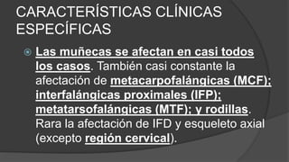 Este documento resume la artritis reumatoide y su abordaje en atención primaria. La artritis reumatoide es una enfermedad autoinmune crónica que inflama las articulaciones y puede afectar otros órganos, causando discapacidad y acortando la vida. Afecta más a mujeres y suele comenzar entre los 30-50 años. Su diagnóstico se basa en la exploración física y pruebas como la presencia del factor reumatoide o anticuerpos anticitrulinados. Su tratamiento busca controlar