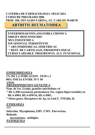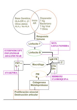 I) La artritis reumatoidea es una enfermedad inflamatoria crónica de origen desconocido que afecta principalmente a las articulaciones periféricas de forma simétrica, causando destrucción del cartílago y erosiones óseas. II) El tratamiento incluye educación, terapia física, antiinflamatorios no esteroideos, corticoides, fármacos modificadores de la enfermedad como metotrexato e inmunosupresores, y cirugía en algunos casos. III) El objetivo del tratamiento