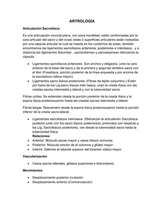 La articulación sacroilíaca es una articulación sinovial plana entre el sacro y la pelvis que está rodeada por una cápsula articular y reforzada por varios ligamentos. La articulación coxofemoral es una articulación esférica entre el fémur y la pelvis que está rodeada por una cápsula articular y reforzada por varios ligamentos como el iliofemoral. La sínfisis del pubis es una articulación cartilaginosa entre los huesos del pubis.