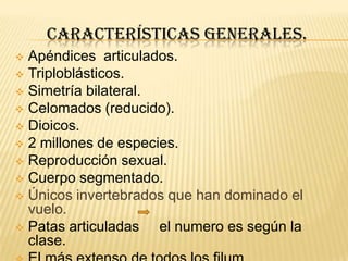 Este documento describe las características generales del filo Artrópoda, incluyendo su anatomía, sistemas y clases principales. Los artrópodos se caracterizan por tener apéndices articulados, ser triploblásticos y tener simetría bilateral. Las cuatro clases principales son los insectos, quelicerados, crustáceos y miriápodos, que se diferencian por el número de patas. Dentro de los quelicerados se describen las clases de los ácaros, arácnidos y merostomados.