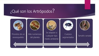 Los artrópodos son animales invertebrados con cuerpos segmentados, exoesqueleto y patas articuladas, que aparecieron hace 570 millones de años y representan el 80% de las especies animales conocidas. Se adaptan a cualquier medio ambiente y sus principales clases son los quelicerados como las arañas y ácaros, los crustáceos como los cangrejos, y los hexápodos como los insectos.