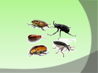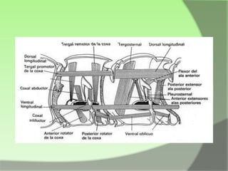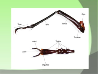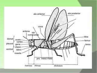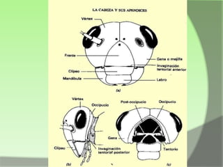 Este documento proporciona información sobre las características generales de los insectos. Los insectos tienen tres regiones principales - cabeza, tórax y abdomen. La cabeza contiene los ojos, antenas y piezas bucales. El tórax contiene las patas y alas. El exoesqueleto recubre todo el cuerpo.