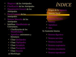 Este documento presenta un índice detallado sobre la morfología y anatomía de los artrópodos. Inicia con la definición y características generales de los artrópodos, luego describe su clasificación y los principales grupos como los quelicerados, crustáceos y mandibulados. Dentro de los mandibulados se enfoca en las clases de quilópodos, diplopodos, símfidos, pauropodos e insectos, detallando la morfología externa e interna de estos últimos. Finalmente, describe las ó